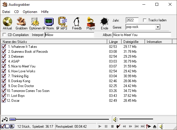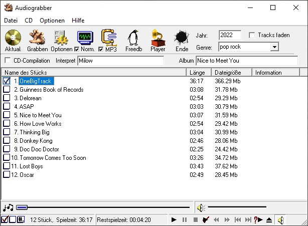 der WAV-Datei generiert Audiograbber dann das grosse MP3-File mit den Tracks 1