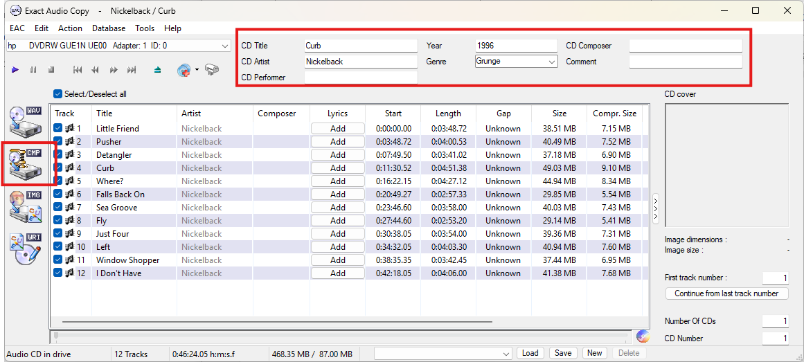unbedingt darauf, dass CD Title und CD Artist und Comment LAME 3.100.1 VBR0 korrekt