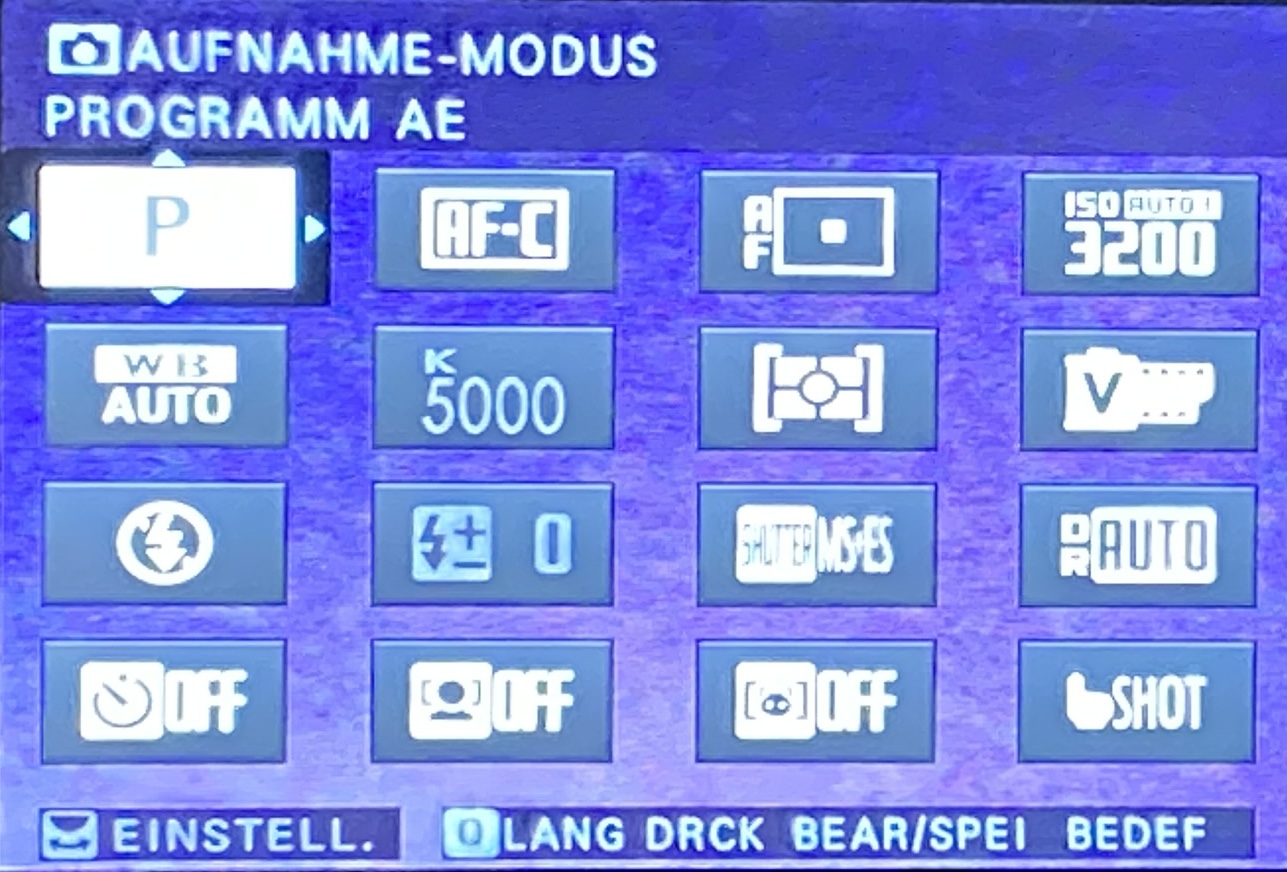 Taste "Q" das Q-MENU aufgerufen. Hier im Aufnahmemodus "P".