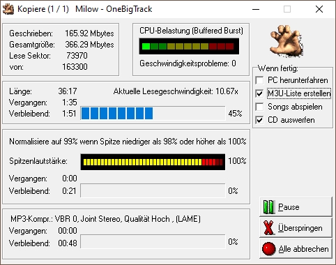 der WAV-Datei generiert Audiograbber dann das grosse MP3-File mit den Tracks 1