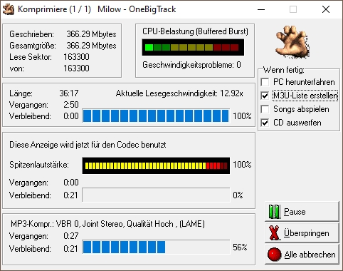 wird die WAV-Datei erstellt. Sie hat eine Gesamtgrösse von 366.29 Mbytes.
