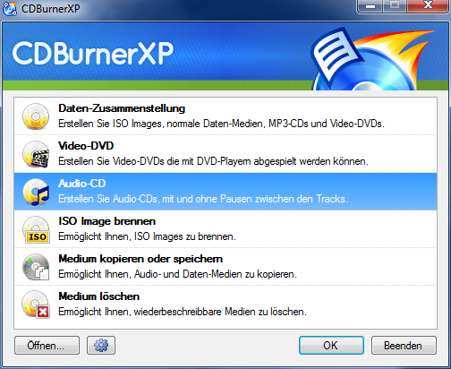 Wir wählen Audio-CD und bestätigen mit "OK".